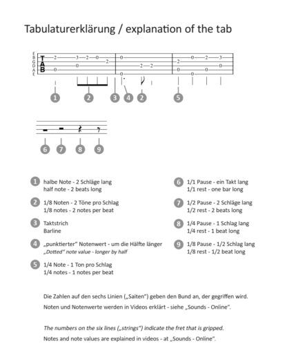 Diese Liedersammlung ist in Tabulatur und klassischer Notenschrift notiert. Die Arrangements sind begleitend zum Gitarre-Unterricht gedacht. So läßt sich das Songrepertoire erweitern und die Fingerfertigkeit erhöhen. Leeren Bässe und einfache Bassfiguren verleihen den Stücken eine harmonische Tiefe und sind das perfekte Training für den Daumen.